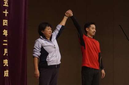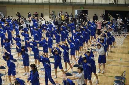ライフコーダによる身体活動量のデータをもとに、自分の生活を振り返り、中学生の今、体力を向上させることが生涯の健康を左右することを学習しました。写真は、参観者も一緒に日体大のラヴェンダー体操を行い、運動による心拍数の変化を測った様子です。