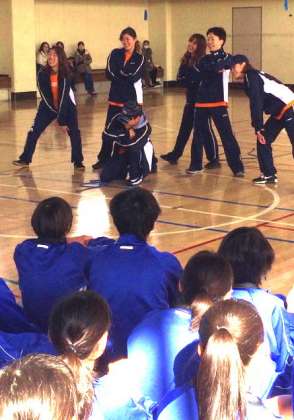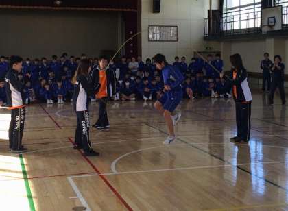 日本体育大学ダブルダッチサークルから、チームTiggeR(ティガー)の6名を講師に迎え、「心と体の元気アップ!ダブルダッチ講座」を開催しました。この講座は、昨年度から取り組んでいるコオーディネーショントレーニングを発展させたものです。はじめは「無理!跳べない!」と思っている生徒も多かったと思いますが、1時間後には、男子2チームと女子チームで対抗戦ができるほどになりました。女子チームが、連続47回跳んで優勝しました!