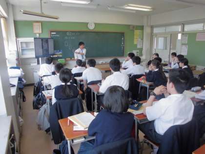 2年生の理科では、今、圧力の勉強をしています。写真は、林主幹教諭による2年B組の授業のようすです。先生が、ICTを活用したとても解りやすい授業をしているので、生徒たちは難しい内容をよく理解しています。あちこちから質問や意見が飛ぶなど、生徒の主体性が感じられる授業でした。