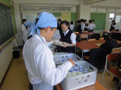 入学から10日が過ぎ、1年生は徐々に中学校生活に慣れつつあります。先週から給食が始まっています。B組でも、給食係がてきぱきと動き、スムーズに配膳が進められていました。