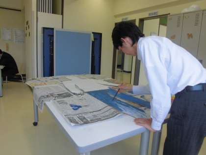2、3年生が3時間かけて取り組んできた「等身大の自分」も、いよいよ完成に近づいてきました(左)。生徒たちは、思い思いの色を使って自分自身を表現しています。作品は、学発展示の機会にまとめて発表する予定です。
