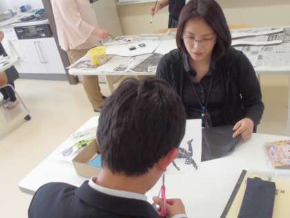 1年生は、通級時にロッカーに貼るコルクマグネットを作っています(中)。デザインを決め、コルクに絵を写し、カッターナイフを使って切り取ります(右)。指先の細かい動きが要求される難しい作業です。静かな環境の中、集中して取り組むことが、心の安定にもつながっている様子です。
