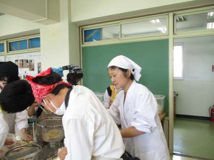 一晩大豆を水につけ吸水させた後、3時間ほどコトコト煮て、柔らかい大豆にし、つぶします。米麹と塩を混ぜ、つぶした大豆と種みそを混ぜ、容器に入れ、仕上げの塩を振って、重石を乗せました。秋に一度「天地返し」をし、3月には完成!各家庭に持ち帰る予定です。