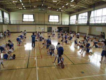 5月2日(月)「体作り講習会」行いました。日本体育大学教授、三宅良輔先生をお招きし、ご指導いただきました。リズム感・柔軟性・体幹トレーニングに取り組み、リズムに乗って楽しく体を動かしました。