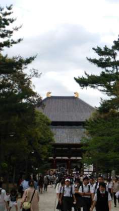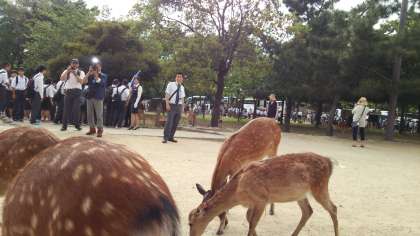 5月27日、本日、最後の参観場所、東大寺到着。可愛い鹿たちに生徒の表情が自然とニコニコ…そして、大仏様に会いに行きます。