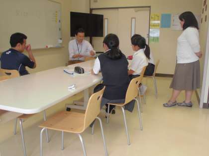 今週の自立活動(小集団)のタイトルは、「上手な聞き方」。前回(5月末)のエクササイズでは、すでにできあがった仲間の中に入り、初対面の人と言葉を交わすきっかけの作り方を学びました。今回は、さらに一歩進んで、上手な聞き方をすることで、相手に好印象をもってもらう方法を、ロールプレイングを通して学んでいます。生徒たちは、実際にうなずき、オウム返し、質問といったポイントを会話のところどころに入れ、上手に聞くことができるようになってきました。すでに、在籍学級で実践してみたという生徒もいました。