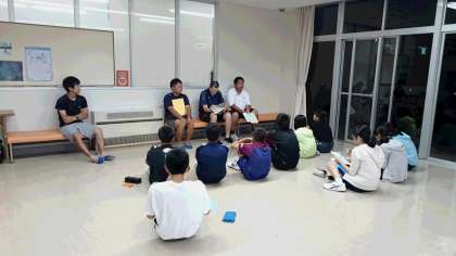 午後9時より、ロビーにて部長会を行っています。10名の部長たちは1日の練習の反省と部屋の様子、部員の体調について、さらには部の目標についても堂々と発表していました。