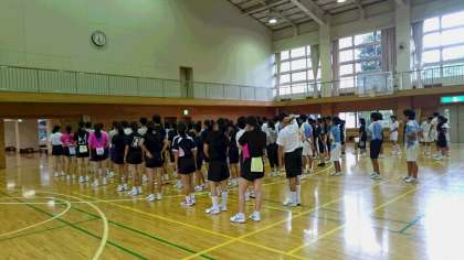 3日目の朝を迎えました。今日は台風の影響で園庭ではなく、体育館で朝の集いを行いました。本日のラジオ体操の担当はサッカー部です。サッカー部は一年生だけですが立派に役割を果たしました。