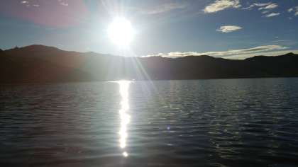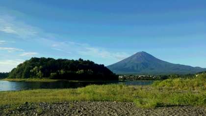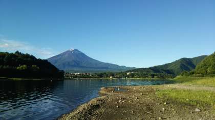 おはようございます。6時、起床です。富士山も白い部分のほんのすこし残る、深い緑と茶色の地肌半分ずつ、夏の真っ盛りの装いです。(湖畔沿いにて撮影)