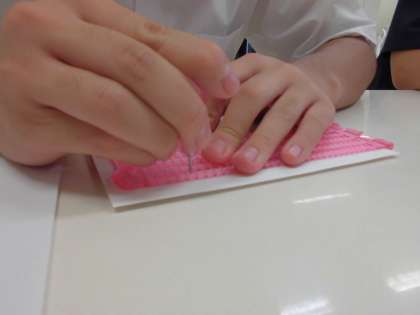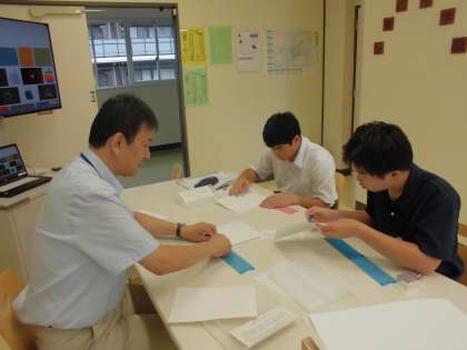 今週の自立活動(小集団)では、自立活動の区分6のうち、(5)コミュニケーション手段の活用として、点字を行っています。生徒たちは、昨年度の手話に続く新たなコミュニケーション手段の獲得に向け、とても積極的に取り組んでいます。点字入りの名刺を作り、職場体験や、来月行われるキャリア校外学習に携帯することを目標にしています。