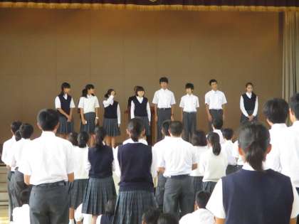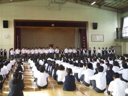 10月2日(月)朝礼では「生徒会認証式」「区陸上競技大会壮行会」が行われました。