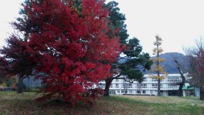 学園到着!ほぼ時間どおりの行程。まあとにかく、紅葉?のきれいなこと?すばらしい。写真は、園庭からです。