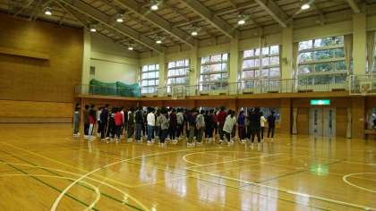 宿泊行事の朝は、早い。6時30分、朝会、開始。遅れないよう、この数分間が勝負。あと2分です。大勢、体育館に入ってきました。