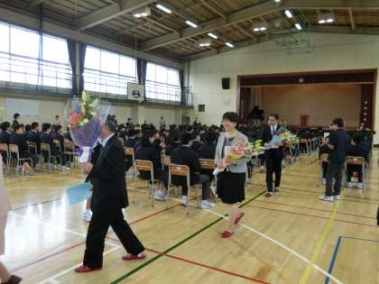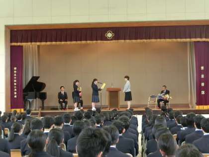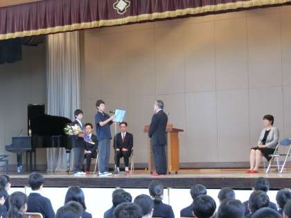 4月27日に離任式がありました。今までお世話になった四名の先生方をお迎えしました。生徒からのお礼の言葉の後、花束を受け取った先生方から尾山台中生への最後の講話がありました。そして全校生徒による校歌が体育館に響きわたりとても心温まる離任式となりました。先生方の新天地でのご活躍を祈念しています。