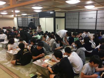 20時30分 体験学習「和本つくり」体験です。和紙の表紙を糸で綴じてから事前に切り抜いた型紙ももとに表紙絵を作成します。
