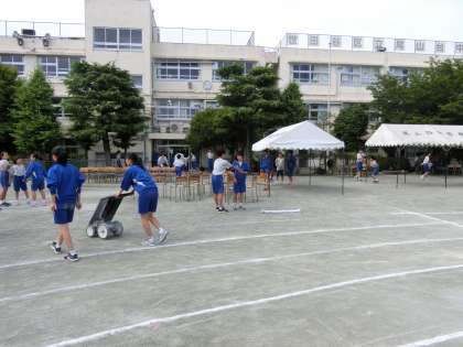 5月25日金曜日 学級対抗リレー、三人四脚、障害物競争の朝練習がありました。また全体練習があり、全学年で演技種目等の練習をしました。14時から前日準備をおこないました。各係に分かれ最終確認をしました。その後、グランドのライン引き、テント張、椅子並べ、スローガン旗の展示などをおこないました。