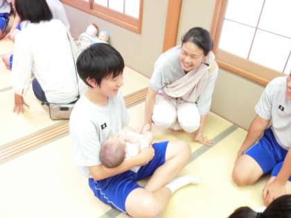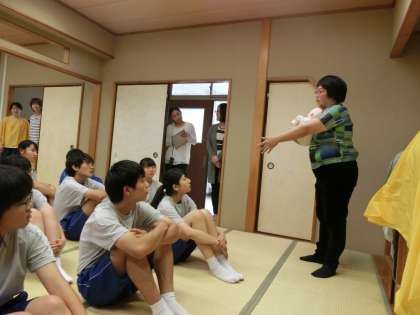 はじめに、赤ちゃん人形を使って抱き方、赤ちゃんとの対話の発声、クーイングの練習をしました。その後、地域の赤ちゃん、お母さんたちと交流、全員赤ちゃんを抱っこさせていただきました。少し怖々抱っこする生徒、腕の中で眠ってしまった赤ちゃん様々でした。交流タイムでは、子育ての喜びや楽しみについてなど、多くのことをお母さんたちに質問しました。