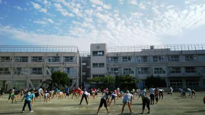 7月23日〜27日、玉堤小学校・学校運営委員会主催「夏休みラジオ体操」が行われました。小学生や保護者、地域の方々が早朝より小学校の校庭に集合し、玉堤小学校の先生や、学校運営委員の方々とともに、尾山台中学校のボランティアのメンバーが前に出て、インストラクターさながら、元気よくラジオ体操の模範演技をしました。5日間休まず、母校の小学校のために、地域のために頑張る尾山台中生を誇りに思います。