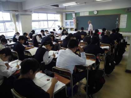 明日から2学期の前期考査が始まります。今日の授業は、考査前最後ということで、生徒たちはいつも以上に真剣に取り組んでいました。先生たちは、質問の嵐にあっていました。写真は2Aの社会の様子です。
