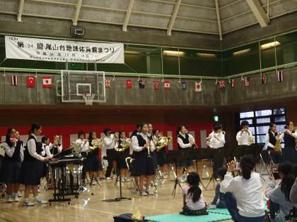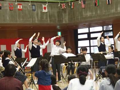 10月14日(日)に吹奏楽部が尾山台地域体育館まつりに招待され、体育館祭りの掉尾を飾って、4曲(イーストコーストの風景、ヤングマン、ふるさと、じょいふる)とアンコール曲(風になりたい)を演奏しました。いつもながら吹奏楽部の演奏は素晴らしく、聞いている人を魅了しました。演奏に取り入れられていたダンスもオリジナルでとても曲に合っていました。演奏の素晴らしさはもちろんですが、吹奏楽部の溌剌とした笑顔やさわやかな挨拶、きびきびした行動、懸命に演奏する姿は見ている人聞いている人を幸せにしてくれます。吹奏楽部の皆さん、ありがとうございました。地域の人々も大変喜んでくださいました。