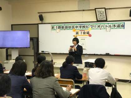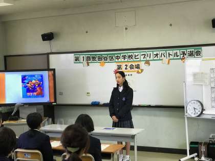 本日午後、梅丘中学校で、ビブリオバトルの予選会が行われました。ビブリオバトルとは、発表者がおすすめの本を紹介し合い、一番読みたい「チャンプ本」を決定する知的書評合戦です。