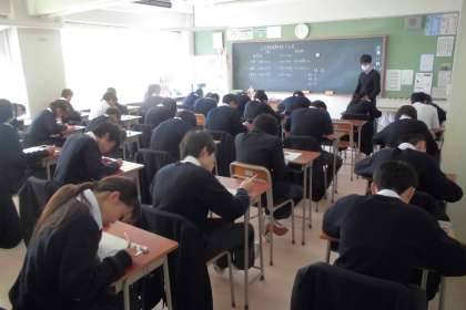 教室では答案用紙を擦る鉛筆の音が響く中、真剣に取り組む生徒の姿が見られました。