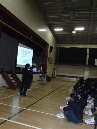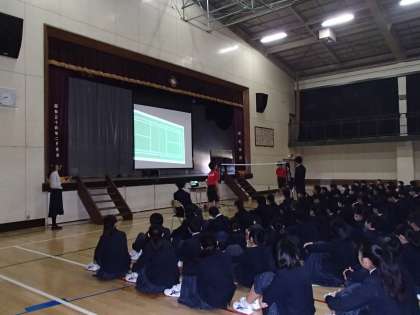 朝礼では、まず教育実習生の紹介がありました。1Aに保健体育科、1Bに数学科の教育実習生が3週間(11/26〜12/14)本校で教育実習を行います。