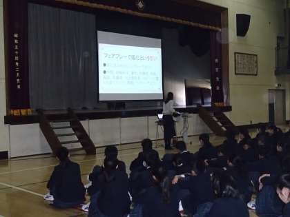 最後に、「フェア」について、ひまわり学級の赤松先生から話がありました。具体的には、フェアプレーの精神についての話でした。本当の「フェアプレーの精神」とは、”スポーツの場面に限らず、日常生活の中でも、自分の考えや行動について善いことか、悪いことかを自分の意志で決められること。自分自身の心に問いかけたとき、恥ずかしくない判断ができる心のこと。”ではないかという話をし、日々の自分の行動をもう一度振り返ってみてほしいという話をしていました。