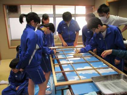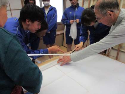 日本家屋や日本文化の良さについて説明していただき、実際に障子の張替を体験することができました。かつては「すす払い」と言われた大掃除のこの時期、本校和室の障子がきれいになり、気持ちも新たに新年をむかえられることに幸せを感ずる尊い授業となりました.