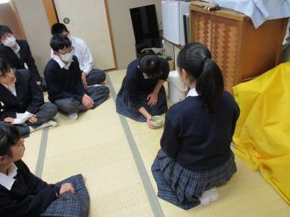 2月4日(月)3年生、教科日本語日本文化の授業では、和室にて「茶道」を体験しました。日本文化部のお手本を参考に、今回は自分のお茶を自分で点てました。干菓子をいただき、少し苦い?抹茶もおいしく、心を落ち着かせる一席となりました。