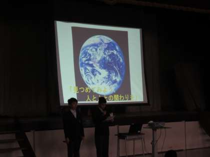 最初は、生徒会から2月2日(土)に行われた「14歳の成人式」についての報告がありました。「14歳の成人式」とは、国際社会、多文化共生社会、東京2020オリンピック・パラリンピックなど、さまざまな人との関わりの中で、私たちが今後、大切にしていかなければならないことは何だろう?ということを世田谷区立中学校の生徒会の代表が月1回集まり、テーマ「見つめてみよう、人と人との関わりを」に向けてそれぞれのブロックごとに実践したものを発表する場です。