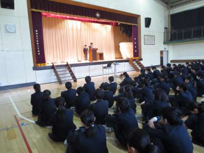 本校生徒会のメンバーである生徒会長・内田くん(2C)、副会長・中島くん(2A)が1年間の取り組みについて発表しました。また、今月の人格の完成のテーマは「やりぬく心」。2人とも1年間生徒会サミットをやりぬいた感想も交えた素晴らしい発表でした。