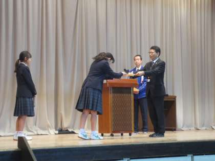 最後に、表彰です。今回は、ガリレオコンテスト、テニス部、バドミントン部、吹奏楽部が表彰されました。日頃の頑張りの成果です。おめでとうございます。