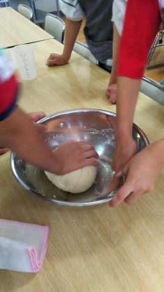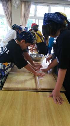 管理人の小林先生に、うどん作りをご指導いただいています。今日の夕飯で自分たちが作ったうどんをいただきます。おいしくなあれ!
