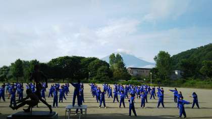 おはようございます。朝礼が始まりました。富士山に見守られ、元気にラジオ体操!今日も1日よい日になりますように