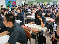 7月2日(火)5・6校時「学び舎小学校6年生」をお迎えし、「小学生の中学校体験」をしました。5時間目は6年生が4つのグループに分かれ、全クラスの授業を参観しました。その後、体育館にて、生徒会が作成した「尾山台中学校の生活」をパワーポイントで紹介しました。小学生は真剣に臨んでくれました。