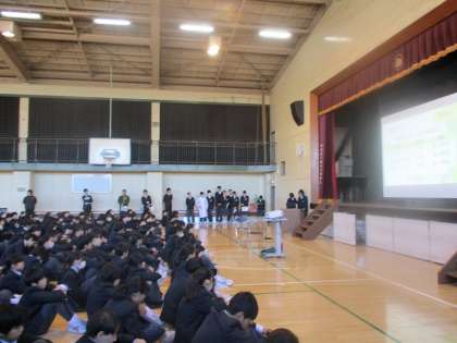 12月16日は生徒会朝礼でした。本日の生徒会朝礼は「保健給食委員」による「感染症予防について」の講演でした。