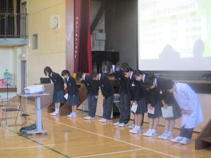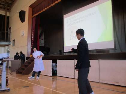 内容は「予防接種」の意義、「手洗い」の大切さ、「マスクの正しい付け方」、「咳エチケット」についての4点です。寸劇やパワーポイントによるクイズ形式や、「咳とくしゃみの小道具」などを駆使し、楽しく、わかりやすく「感染症予防」について、説明がありました。保健給食委員で時間をかけて台本を準備し、練習を重ね、心に響く発表でした。これから寒い日が続きます。感染症に気をつけ、風邪などひかぬよう元気にこの冬を乗り越えよう。