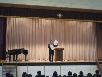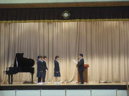 表彰では、吹奏楽部が多摩アンサンブルフェスタの木管五重奏で金賞を受賞しました。日頃の練習の成果ですね。おめでとうございます。