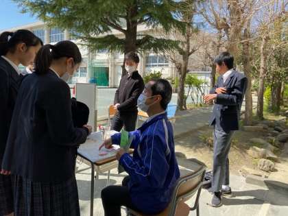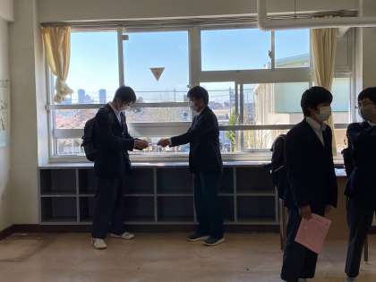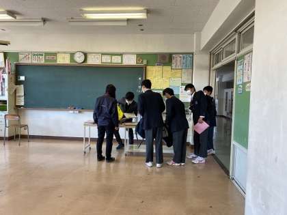 今日の登校の目的は、通知表と修了証の授与と、臨時休業中の宿題の提出でした。一人一役ボランティアで、少しだけ教室に残っていた掲示物をはがしたり、机や椅子を運んだり、新年度に向けて教室整備をしました。先生たちも久々の再会をとても嬉しく思いました。生徒の皆さんも久しぶりに会う仲間となごり惜しそうな様子でした。