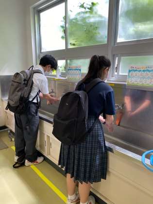 明日は1年生の分散登校日です。時間に注意し、登校してください。また、このホームページの写真を見て、教室に入る前の様子をイメージしてみてください。もちろん先生たちも誘導指示します。