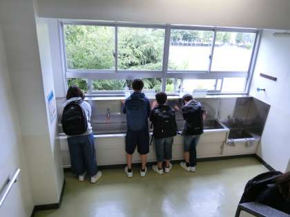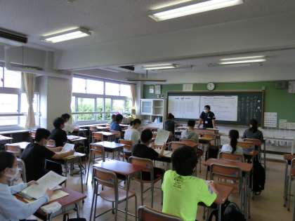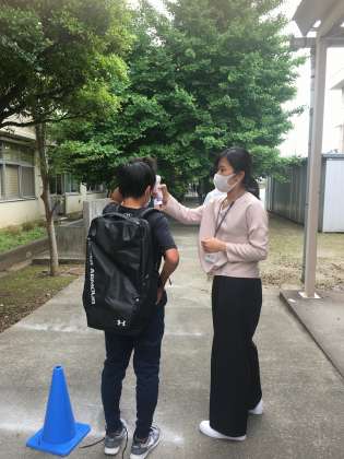 本日は、1年生の「第3回資料配布・回収日」でした。3年生同様、学級を2つのグループに分け、前半グループと後半グループで時間差をつけての登校でした。マスクをつけての登校、校舎に入る前に非接触型体温計で、ひとり一人体温を測りました。やや緊張の面持ちで検温をしていました。初めて1年生の昇降口に行き、自分の下駄箱を確認して、上書きに履き替えました。真新しい黄色いラインが光輝いていました。下駄箱から3階教室へ行く途中、手洗い所でしっかりと手洗いをしました。