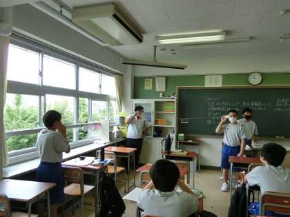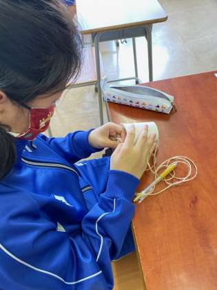 まだまだ知らないクラスメートも多い1年生です。また3時間の分散登校や新しい生活様式を実施しているので気軽に話しかけるのもなかなか難しい状況でした。そこで、今日は密にならないように距離を保ちながら話すために学年主任の大橋先生のアイデアでiPhone(アイフォン)ではなくmy Phone(マイ フォン)を作りました。紐の先についているクリップをつなげるだけで何人の人とも同時に話すことができるのです。また、ひもがピンと張っていないと聞こえないので自然とソーシャルディスタンスを保つことができます。「これから、どうやって作るの?」「聞こえないよ。」「もっとピンと張って。」等と言いながら、色々な人と話をすることができました。休み時間にもmy Phoneで話している姿も見られました。