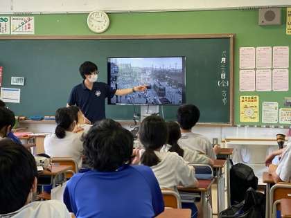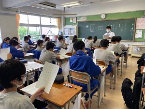 70年前に創立された尾山台中学校。教育目標も70年間引き継がれてきました。創立当時の「教育目標」に込められた思いを読み解いています。ワークシートを使って、教育目標に迫りました。70年前の写真を導入に使い当時を回想して70年間に思いをはせたり、大きな声で教育目標を復唱したり、社会の資料集年表でしらべたり、未来の自分を想像したり・・・70周年記念のプロローグとなりました。