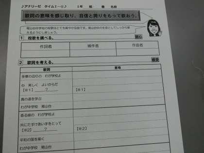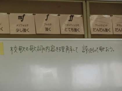 本校の校歌について学びました。みなさんもご存じのように作曲者は、NHK朝ドラで有名な古関先生です。