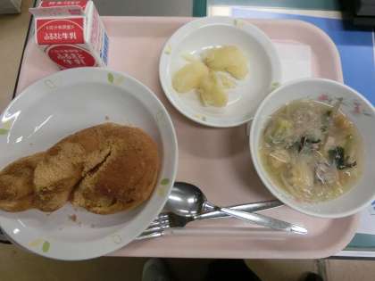 今日の給食メニューは、みんなが大好きな揚げパンです。ガーリックポテト、肉団子入り春雨スープです。みんな残さずに食べましょう。
