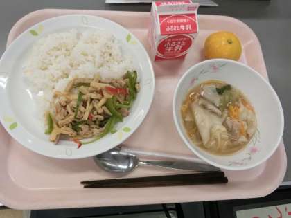 本日の給食メニューは、青椒肉絲丼、ワンタンスープ、冷凍みかん、牛乳です。
