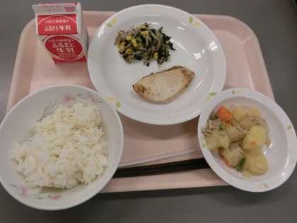 本日の給食メニューは、麦ごはん、さわらの七味焼き、塩肉じゃが、野菜のいそあえです。