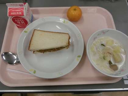 本日の給食メニューは、ドライカレーサンド、ミルクポトフ、冷凍ミカン、牛乳です。