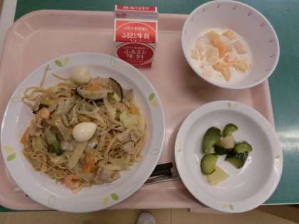 本日の給食メニューは、あんかけ焼きそば、野菜の香味漬け、フルーツヨーグルト、牛乳です。